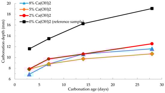 Effect of Ca(OH)2 dosage on carbonation depth of 100 × 100 × 100/300 mm3 AAS paste compared to reference AAS sample without Ca(OH)2 [61].