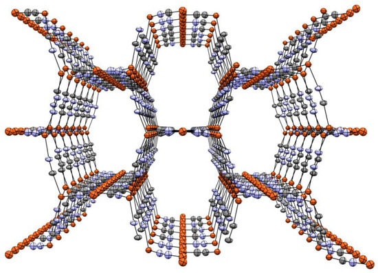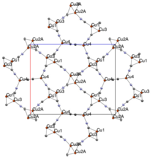 The structure 1 solved in the orthorhombic space group Pnma. The crystallographically independent unit consists of four Cu atoms, four full and four half cyano groups, and four half Me4N+ ions, summing to the formula: (Me4N)2[Cu4(CN)6]. As shown in Figure 1, complex 1 is composed of a series of {Cu2(CN)4(μ2-CN)2} rhomboids crosslinked by cyano ligands and D3h {Cu(CN)3} metal clusters to form 2D planar sheets. The {Cu2(CN)4(μ2-CN)2} rhomboids, which feature 4-coordinate Cu centers with close Cu…Cu interactions, have been seen in several related cyanocuprate structures [53,55,61,62,63,65]. The 2D sheets are further crosslinked via perpendicular cyano ligands emanating from the rhomboids to form a 3D coordination network composed of large five-sided channels bounded by three rhomboids and two D3h units. All Me4N+ ions lie within these channels.