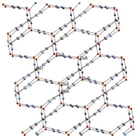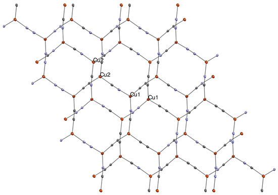At 295 K compound 2 crystallizes in the monoclinic C2/c space group, Figure 2. The unit cell holds only one and a half independent Cu atoms and two CNs, both of which are non-symmetrically disordered (63:37 and 56:44, respectively). The half-independent Cu(I) center is 2-coordinate and lies on a linear C∞v coordination site, while the other is 3-coordinate and roughly trigonal planar (D3h). All Cu atoms are connected by μ2-bridging cyano ligands, forming simple 2D sheets composed of elongated fused hexagonal {Cu8(CN)8} rings. This and closely related motifs have been observed previously [51,55,58,59]. The rings are stacked such that trigonal Cu2 lies almost directly above linear Cu1, the shortest interplanar Cu⋯Cu distance being 3.076 Å and, thus, without metallophilic interactions. Again, two crystallographic inversion centers are observed, one at the macrocyclic ring center and the other at Cu1, shared between adjacent rings. Only one independent, two-site disordered Me4N+ ion is present, located between the sheets centered on openings in the macrocycles.