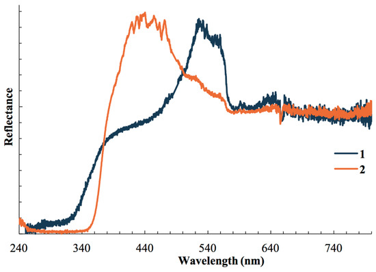 Solid samples of 1 and 2 both present themselves as off-white under room light. We have performed diffuse reflectance measurements of these complexes at 298 K, shown in Figure 5. All compounds absorb strongly in the UV region, with absorbance for 1 extending into the visible due to the presence of two absorption bands, one at 290 nm and 450 nm. The absorption edge of 1 (2.64 eV) is lower in energy compared to that of 2 (3.25 eV). Emission bands are observed for both complexes in the DRS spectra. We tentatively assign the absorption bands to a variation of metal-to-ligand charge transfer (MLCT) which we have observed in other cyanocuprate(I) complexes that lack electron-accepting cations [17,30,69,70,71]. In the case of 1 we ascribe the lower energy absorption edge to lower ground and excited state energies due to metallophilic interactions observed in the crystal structure.
