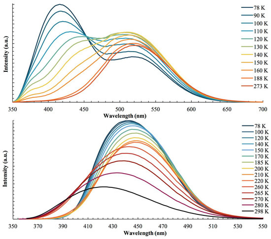 Luminescence spectra of 1 (top) and 2 (bottom) between 78 K and 298 K. The emission was measured at λex= 315 nm and λex = 330 nm for 1 and 2, respectively.