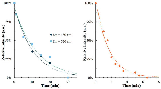 Relative emission loss over time for 1 (left) and 2 (right) at 78 K under 255 nm laser irradiation. Note that the emission signal of 1 is deconstructed to show the independent intensities of the dominant emission peak at 430 nm and the less intense emission peak at 526 nm.