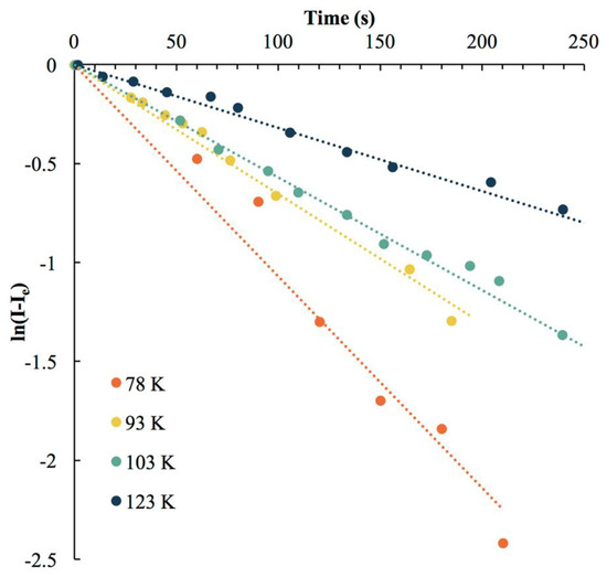 where It is the normalized intensity at time t, Ie is the intensity at equilibrium, and k1 and k−1 are the forward and reverse rate constants, respectively [81]. Thus, a plot of ln{[I]t−[I]e} versus time should yield a linear line with a slope whose negative is the sum k1+k−1, defined as ke, Figure 9. At low temperatures we are able to maintain the reduced emission intensity without continuous irradiation. Thus, at 78 K the forward rate is much larger than the reverse rate which can be considered zero or negligible. We can then simplify the term ke = k1 + k−1 to be ke = k1 at low temperatures (for 2 at 78 K ke = k1 = 1.07 × 10−2 s−1). We expect the forward photochemical reaction is dependent only on the laser energy and is independent of temperature. Instead, it is the reverse reaction that is temperature dependent. So, upon heating the sample, the forward reaction remains constant while the reverse rate increases and becomes non-negligible. Continuous heating eventually results in k−1 = k1 which is evident by a decrease of ke with increasing temperature and a lack of intensity reduction with laser irradiation. This temperature represents the maximum operational temperature for an optical memory active complex. As expected, increasing the temperature during irradiation at 255 nm for 2 results in a decrease in the emission intensity reduction rate. Since we can now calculate k1 and k−1 at different temperatures we can also readily calculate Keq and plot ln(Keq) versus temperature to obtain the recovery activation energy via the Arrhenius equation. For 2 we calculate an activation energy of the recovery reaction of 1,886 J/mol for which using the Boltzmann constant equates an operational temperature of 227 K.