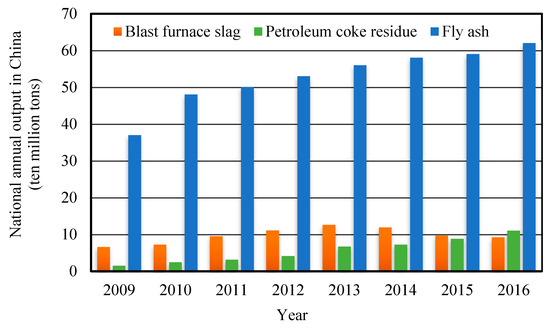 For the oil refining industry, petroleum coke is the final product of petroleum after delayed coking treatment; the petroleum coke residue is the solid waste produced by the combustion and utilization of petroleum coke [1]. According to the data of “National Bureau of Statistics- Environmental Statistics Yearbook” [2], the national annual output of different solid industrial wastes in China is shown in Figure 1. The Sulphur content of petroleum coke is as high as 5–8%, which is not suitable for use as a raw material for chemical and metallurgical industries with high quality requirements [3]. Meanwhile, petroleum coke produces Sulphur dioxide after combustion as fuel, which seriously pollutes the atmosphere environment and affects human health. Therefore, it is very necessary to desulfurize high sulfur petroleum coke during combustion for utilization.