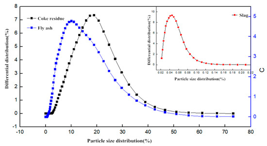Ordinary Portland cement (PO 42.5R), which met the requirements of National Standard of China (GB/T) 1346-2011 [11], was used in this study. The detailed parameters of aggregates are shown in Table 1 and Table 2. Ordinary II-level fly ash (density is 2.24 g/cm3) and ground granulated blast furnace slag (density is 2.88 g/cm3) were used. The obtained petroleum coke residue from the refinery was vibrated and finely-ground by ball-mill (LAIZHOU WANKAI MACHINERY CO., LTD., Laizhou, China) to be taken as raw materials. The ball mill is a horizontal cylindrical rotating device driven by external gears. The centrifugal force produced by the rotation of the cylinder makes the steel ball roll continuously and grinds the petroleum coke residue. The photos of petroleum coke residue before grinding and after grinding are shown in Figure 3. The fineness of petroleum coke residue before grinding is similar to that of sand, and the particle size distribution of coke residue after grinding is similar to that of ordinary fly ash The specific surface area tested by BET Automatic Measuring Instrument (F-Sorb 2400-BET, Gold APP Instrument Corporation, Beijing, China) was 4065 cm2/g. The particle size distribution of coke residue, fly ash, and ground granulated slag is shown in Figure 4.