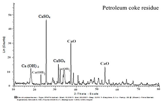 X-ray diffraction (XRD, D8 Advance, Bruker AXS, Germany) and X-ray fluorescence (XRF, S8 Tiger, Bruker AXS, Germany) were performed to characterize the cement and mineral admixtures. The XRD map of petroleum coke residue is shown in Figure 5. The obvious diffraction peaks of CaSO4 II (2θ = 25.53, 31.46, 32.15) and CaO (2θ = 38.58, 53.84) can be found in the figure. In order to determine the proportion of CaSO4 II and CaO in desulfurized petroleum coke residue, an XRF test was carried out. Table 3 provides the chemical compositions of cement, fly ash, and blast furnace slag, as well as petroleum coke residue, as measured by XRF analysis. Because the XRF analysis will offer the content of carbon element inaccurate measurement, the loss of ignition test of petroleum coke residue was also conducted. Through the calculations, the CaSO4 II content is 39.98%, CaCO3 content is 3.18%, and free CaO content is 43.42%. In addition, it contained 3.7% amorphous carbon (C), 1.4% CO2, and other impurities. Therefore, it can be concluded that the sulfur content of petroleum coke residue mainly exists in the form of CaSO4 II, while the remaining calcium element mainly exists in the form of CaO.