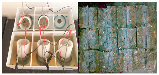 The specimens of concrete were made into a cylinder with a diameter Φ (100 ± 1) mm and a height of h (50 ± 2) mm, and then were put in a water tank to start the water-curing in a standard curing room. At the age of testing, the specimens were submerged in an ultrasonic bath for 15 min before starting the test. After that both sides of the test specimens were linked with a 40 V voltage, then the positive and negative electrodes of specimens were immersed in the 0.2 mol/L KOH solution and 0.2 mol/L KOH solution containing 5%NaCl, respectively. The electric time was determined according to the initial electric current. After the electric current was over, the specimens were chopped into two halves by a pressure machine, and a 0.1 mol/L AgNO3 solution was sprayed on the surface of split specimens. The penetration coefficient of chloride ions of concrete was calculated by the penetration depth of chloride ions. The Cl− penetration device and testing specimens are shown in Figure 6.