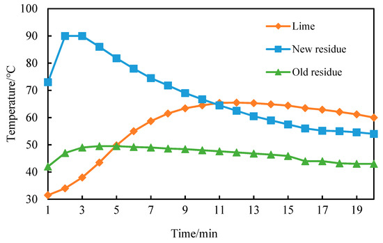 Exothermic characteristic curve of new residue, old residue, and lime.