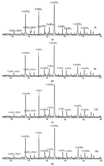 From Figure 8, it can be seen that CaO in petroleum coke residue reacts with water to form Ca(OH)2, and the height change of the Ca(OH)2 diffraction peak is not obvious during the time range of 3 h–24 h, which indicates that CaO reacts with water rapidly. Moreover, there are weak diffraction peaks of CaSO4·2H2O at 2θ = 11.611, 20.758, which shows that CaSO4 can be partially hydrated to CaSO4·2H2O at 20 °C. However, the characteristic peaks of CaSO4 are still high in the above cases, which proves that hydration rate of CaSO4 is very slow and the degree of hydration reaction is insufficient at this time. This result of petroleum coke residue paste is similar to that of natural anhydrite at 20 °C curing condition, with a slow hydration process and low hydration rate [18,19].