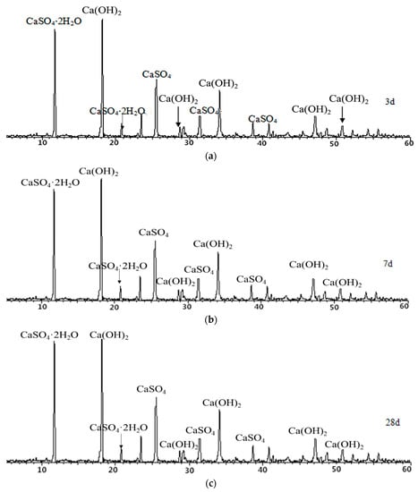In order to further study the hydration of desulfurized petroleum coke residue under room temperature and long curing time, a standard consistency paste of petroleum coke residue was prepared. The paste was cured for 3, 7, and 28 days under standard conditions, respectively, and then XRD analysis was carried out. The results are shown in Figure 9. From Figure 9, the characteristic peak of CaSO4 tends to weaken with the increase of curing age. The obvious characteristic peak of CaSO4·2H2O appears in the XRD map, which proves that under the standard curing condition, CaSO4 in petroleum coke residue is partially hydrated to CaSO4·2H2O. The peak value of CaSO4·2H2O in Figure 9 is higher than that in Figure 8, which indicates that hydration degree becomes more sufficient with the increase of curing time. However, according to the change of peak value of CaSO4·2H2O in Figure 9, the amount of CaSO4·2H2O is basically stable after 3 days. It might be that CaSO4·2H2O formed after hydration is wrapped on the surface of anhydrite minerals, which prevents further hydration of CaSO4. The hydration law of CaSO4 in anhydrite is similar to that of petroleum coke residue; the hydration reaction is basically stable after 3 days, and can be further improved in a short time by improving the fineness of anhydrite and adding different activators [20].