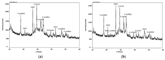 XRD maps of different concrete specimens at 28 days: (a) Ordinary cement; (b) 10% coke residue, and 90% cement.