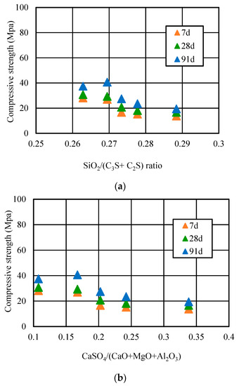 Figure 12 showed the relationship between the SiO2/(C2S + C3S) ratio and compressive strength, and the CaSO4/(CaO + MgO + Al2O3) ratio and compressive strength of coke residue concrete. According to the Bogue Equations (2) and (3) [22], taking advantage of the parameter data in Table 3, the C2S and C3S amount of concrete with different replacement ratios of coke residue at different curing ages can be calculated finally.