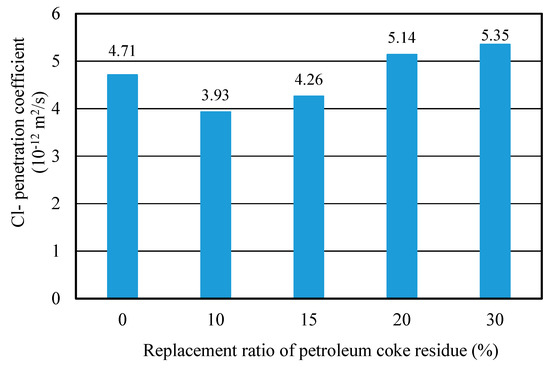 Figure 13 showed the Cl− penetration coefficients of concrete with different replacement ratios of coke residue at 28 days. It can be observed that the curve of Cl− penetration coefficient first decreased and then increased. When the replacement ratio of coke residue was 10%, the Cl− penetration coefficient was the lowest and the resistance-penetration performance was the best; when the replacement ratio of coke residue was more than 10%, the Cl− penetration coefficient of concrete increased with the replacement ratio. This revealed that 10% petroleum coke residue in concrete has a fine filling and micro-aggregate effect. It can produce a more solid C-S-H gel and small size hydration products to fill the pores, improving the pore structure and compactness of the concrete. The internal penetration of chlorine ions in concrete probably could be hindered [24]. This result was in agreement with compressive strength. In addition, it is noteworthy that although the Cl− penetration coefficient of concrete at 15% was also lower than that of ordinary concrete, the CaSO4 amount of concrete was relatively high and the strength of concrete was lower than ordinary concrete. Therefore, from the results discussed above, it can be determined that the upper limit of effective replacement ratio of single-added petroleum coke residue in concrete was 10%. With a better strength improvement, the strength of concrete will decrease obviously when the replacement ratio of petroleum coke residue exceeds 10%.