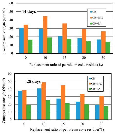 Figure 10 showed the relationship between the compressive strength and replacement ratio of petroleum coke residue in concrete. It can be seen that the strengths first increased in the beginning, and then decreased along with the increase of replacement ratio. At 3 days, the strength of concrete at the replacement ratio of 10% reached the same level as that of ordinary concrete. Although the strength of concrete at the replacement ratio of 10% was slightly lower than that of ordinary concrete at 7 and 14 days, there was an obvious improvement in the strength at 28 days, where it increased by about 11% more than the ordinary concrete. However, when the replacement ratio was high and exceeded 10%, the strength of the petroleum coke residue concrete decreased sharply with the replacement ratio, decreasing by about 30%, much lower than that of ordinary concrete. Therefore, the replacement rate of 10% is reasonable for improving the strength of petroleum coke residue concrete.