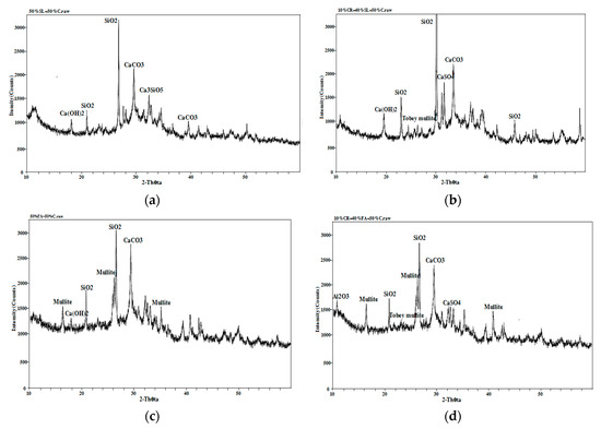 XRD maps of different concrete specimens: (a) 50% slag and 50% cement; (b) 10% coke residue, 40% slag, and 50% cement; (c) 50% fly ash and 50% cement; (d) 10% coke residue, 40% fly ash, and 50% cement.