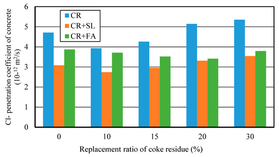 Cl− penetration coefficient of coke residue concrete with different replacement ratios.