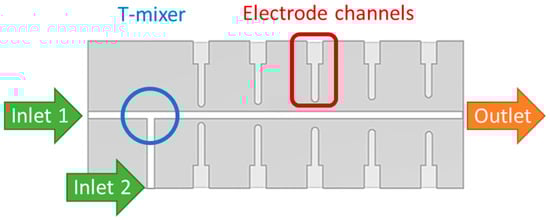 The microreactor is composed of two structured parts that have to be joined after the shaping process. Its structure consists of two inlet channels connected through a T-mixer to the reaction channel on which both sides five pairs of electrode channels are positioned at a maximum distance from each other. Figure 2 and Figure 3 depict the reactors’ design schematically and describe the functions of the channel structures.