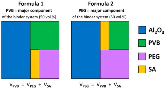 The alumina powder was mixed with several organic vehicles to get a well-suited molding compound for the CIM process. Polyvinyl butyral (PVB, Mowital B30 H, Kuraray Europe GmbH, Hattersheim am Main, Germany) was used as the structural polymer (Mn = 2.12 × 104 g/mol). Polyethylene glycol (PEG 4000, Roth GmbH, Karlsruhe, Germany) was used as the basic polymer of the binder system. Stearic acid (Roth GmbH) was used as dispersant to achieve a steric stabilization of the alumina powder particles inside of the binder matrix. Its ratio was fixed to 4.4 mg/m2 of the powder surface. Figure 4 shows the two different PVB:PEG ratios that were investigated. The alumina content was varied from 50 vol.% up to 64 vol.% for Formula 1.