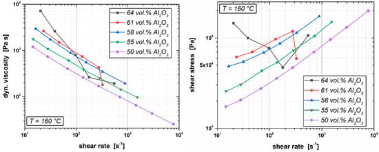 Rheological characterization of polyvinyl butyral- (PVB-)/polyethylene gycol (PEG)-based molding compounds with filler degrees of alumina powder between 50 vol.% and 64 vol.%.