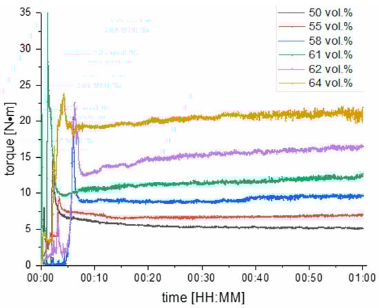 Another important parameter to take into account in relation to the powder load of a molding compound is the torque that appears during the mixing procedure of the feedstock components. As shown in Figure 6, higher powder loads entail higher equilibrium torque. Additionally, the results of the mixing characteristics did not show that the mixing phase is significantly prolonged for higher filler degrees. A mixing phase of 30 min seems to be enough for all tested compounds. In Figure 6, the mixing characteristics of compounds with filler contents between 50 and 64 vol.% for a temperature of 125 °C are depicted and it appears that all compounds reach their equilibrium torque within the first 10 minutes of mixing. In contrast to the required mixing period, the mixing torque strongly depends on the filler content. Figure 6 shows that the equilibrium torque increases from 5 N·m for a feedstock with 50 vol.% powder content to a critical value of 20 N·m for a feedstock filled with 64 vol.% ceramic powder. This strong influence of powder content limits the maximum powder loading to less than 61 vol.% if an appropriate processability is to assure.