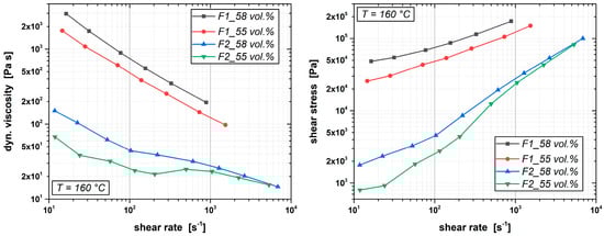 Rheological characterization of PVB-/PEG-based molding compounds with different quantities of the binder components (F1 and F2) for two different alumina powder filler degrees (55 vol.% and 58 vol.%).