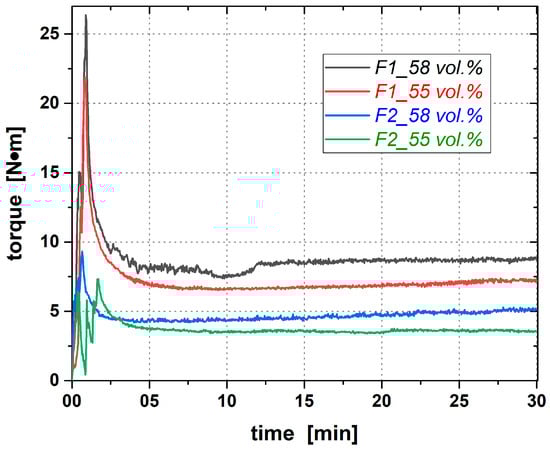 This decrease of the molding compounds’ viscosity with increasing the amount of PEG also leads to lower required torques for mixing the components together, as it is shown in Figure 8. Regarding the mixing characteristics, it can be mentioned that all the four feedstocks can be mixed at 125 °C with lower end torques than 10 N·m (Table 4). However, the ratio of PVB to PEG has a strong effect on the mixing behavior, too.