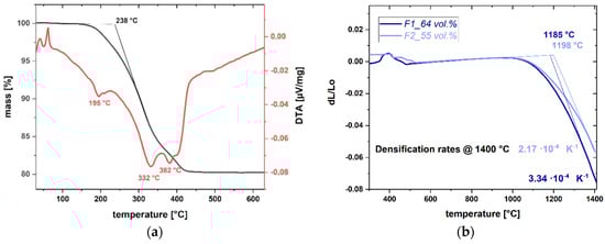 During the sintering process, the component shrinks due to the closing of the pores between the alumina particles that occur during the debinding process. The unidirectional shrinkage of molding compounds (formula F1) with 55 and 64 vol.% alumina content was investigated by dilatometry. As Figure 9 shows, the densification of the Al2O3 particles starts around 1180 °C and reaches its maximum around 1210 °C for an alumina content of 55 vol.%. A higher filling degree of 64 vol.% facilitates the sintering of the particles and a slightly higher shrinkage rate is detected.