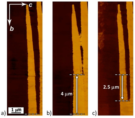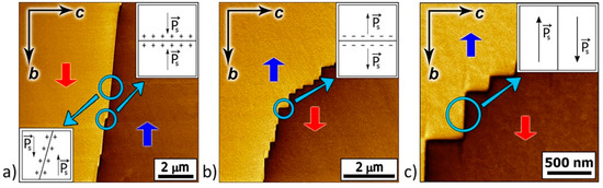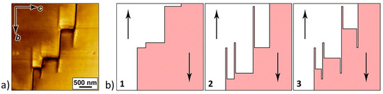 During polarization reversal, the elementary steps (pairs of kinks and antikinks) with a height of one lattice constant (Figure 3a) were generated at the domain wall, after which the charged kinks and antikinks moved along the polar axis [36]. The domain wall deviates from the polar direction and becomes inclined if the kinks are distributed uniformly (Figure 2a and Figure 3c). The nonuniform kink distribution along the domain wall led to the formation of macrosteps with an increased kink concentration, which can be observed by PFM (Figure 2b and Figure 3b). The wall motion velocity is proportional to the kink concentration, so the macrosteps seem to have moved along the neutral domain wall during polarization reversal.