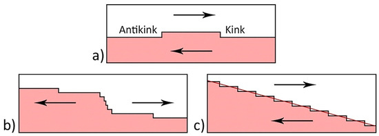 Schematic images of domain walls: (a) The formation of elementary steps, (b) macrostep with increased kink concentration, and (c) domain walls with uniform kink distribution. The arrows indicate the spontaneous polarization directions.
