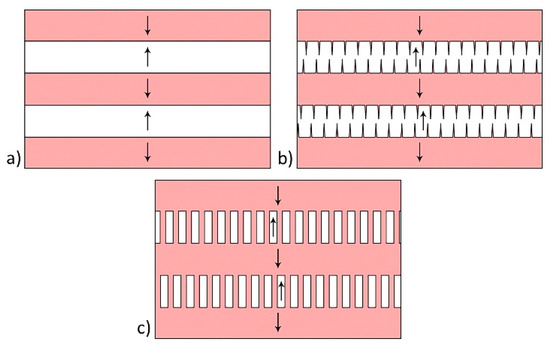 Schematic images of needle-like domain ensembles formation: (a) Initial domain structure, (b) polarization switching in one direction, and (c) merging of the projecting parts of charged domain walls. The arrows indicate the spontaneous polarization directions.