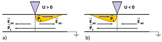 The areas with stripe domains and irregularly shaped large domains were chosen for local polarization reversal. Two switching types were performed to identify the contribution of the backswitching to the domain formation: (1) With withdrawal of the probe immediately after the end of the pulse and (2) without withdrawal of the probe. The polarization reversal on a nonpolar cut occurred under the action of the in-plane component of the electric field created by the probe (Figure 8) [25]. The shallow domains (shown in yellow) were formed in the areas where the local electric field was above the threshold field, and the stable polarization state (opposite to initial polarization) appeared.