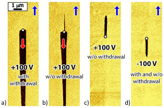 Lack of probe withdrawal from the crystal surface facilitates backswitching due to the external screening of the depolarizing field by the current in the external circuit [21]. For local polarization reversal by positive voltage pulses, a partial or complete backswitching and the formation of reverse domains were observed (Figure 9b,c).