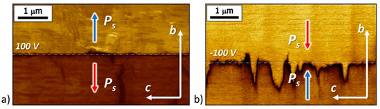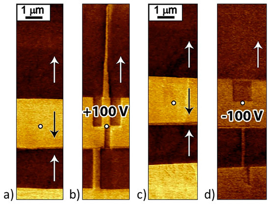 For the local polarization reversal by a negative pulse (U = −100 V; t = 30 s) with probe withdrawal, a zigzag-shaped (head-to-head) wall (Figure 10e) formed at the probe location (Figure 10c,d). Switching in the areas up to 2 µm from the probe can be attributed to the field produced by injected charges [38,39,40].