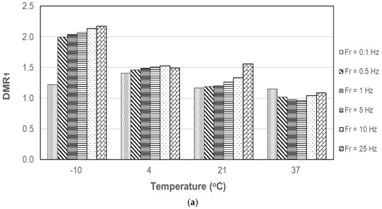 The ratio of dynamic modulus (DMR) was analyzed by using Equation (3):