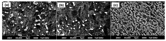 The chemical composition of both phases in all microstructures of the investigated alloys was analyzed using the EDS unit attached to SEM. The averaged chemical composition (wt. %) for each investigated alloy is displayed in Table 4 and Table 5. It was evident that the Ti, Al, Sn and Zr elements tended to more segregate to α phase than to β phase [27]. However, V, Nb, Cr and Mo were β forming elements [28], meaning that higher ratios of these elements werefound in β phase rather than in α phase.The detailed EDS linescan/map analyses are discussed in the Supplementary Materials (Figures S1–S3).