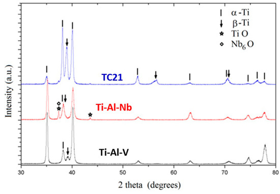 Phase identification was performed by X-ray diffraction (XRD) patterns to define the phases comprising each alloy sample. The diffraction patterns recorded for the studied alloys are compared in Figure 3. The phases were identified by matching the characteristic peaks with the Joint Committee on Powder Diffraction Standards (JCPDS) files [29]. The phases α-Ti (JCPDS#00-044-1294) andβ-Ti (JCPDS#00-044-1288) were common and dominated the composition of the three studied alloys. The Ti-Al-V and TC21 alloys were found to contain solely α-Ti and β-Ti phases, respectively. On the other hand, Ti-Al-Nb alloy contained some Ti and Nb oxides, TiO (JCPDS#00-008-0117) and Nb6O (JCPDS#00-015-0258).