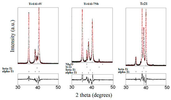 In the Rietveld adjustment of the Ti-6Al-4V alloy, the hcp α-Ti (Space group ) together with the bcc β-Ti (Space group ) dominated the composition of the alloy. In the second alloy, Ti-6Al-7Nb, the formation of some TiO (Space group ) and Nb6O (Space group ) was observed and they formed larger crystallites than those formed in the Ti phases. The total weight percent of those oxide phases was less than 10% (Table 6). For the third alloy, TC21, only α- and β-Ti phases were observed in the XRD patterns. No oxide phases were detected due to the slight oxygen content of this alloy. Nevertheless, there weresome mismatches between the wt% values obtained from the Rietveld adjustments and the corresponding wt% values determined with other techniques. This was attributed to the behavior of the preferred orientation of the α-Ti phase observed for the reflection (100), which was relatively stronger for the Ti-6Al-4V and Ti-6Al-7Nb alloys than in the TC21 alloy.