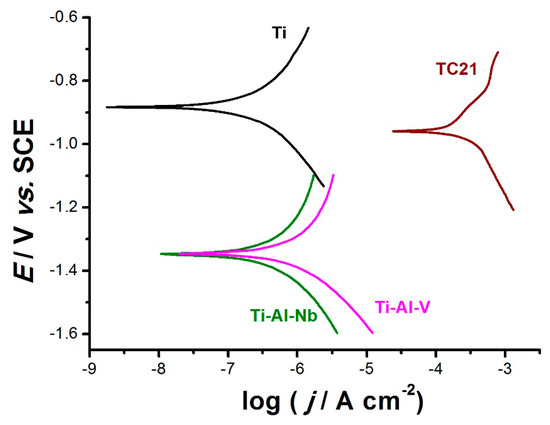 Indeed, Tafel slopes and respective calculated uniform corrosion rates for a metal covered with a semi-conductive passive film raisedstrong doubts, despite the utilization of the Tafel extrapolation method to determine corrosion rates for Ti and some Ti-based alloys [35,36]. In addition, in Figure 5, the polarization curves do not display the expected log/linear Tafel behavior. This was clear in both the anodic and cathodic branches of alloys Ti-6Al-4V and Ti-6Al-7Nb and as well as in the anodic branches of Ti and TC21 alloy, which exhibited some sort of curvature over the complete applied potential range. This in turn made evaluation of Tafel slopes by Tafel extrapolation method, and hence corrosion rates, inaccurate [37,38,39]. There is, therefore, an uncertainty and source of error in the numerical values of Tafel slopes (βa and βc), and possibly in the values of jcorr.