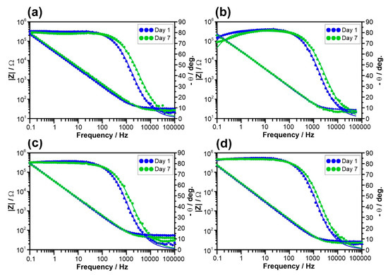 EIS measurements were also conducted at the respective Ecorr during sample’s exposure in 0.9% NaCl solution at 37 °C to confirm the polarization data and to assess the kinetics of the uniform corrosion process on alloy surface. The measurements were carried day-by-day allowing for monitoring of uniform corrosion susceptibility [40,41,42]. Figure 6 displays the impedance plots in Bode projection, recorded for the studied alloys during the second and the last day of exposure. Pure Ti (99.99%) was also included for comparison (see Figure 6a). The impedance spectra recorded on Day 1 (after initial 120 min of conditioning) were highly scattered due to non-stationary conditions at the metal/electrolyte interface, which is a common problem in EIS measurements. This issue became negligible after a few hours of exposure. For this reason, results recorded on Days 2–7 were considered for further analysis. All the impedance plots exhibited a single time constant (capacitive loop). The overall corrosion resistance of each investigated alloy was very high; the impedance modulus |Z| linearly increasedwith frequency decrease, reaching over 105 at 0.1 Hz. For each studied alloy, inclination of the phase angle θ was shifted towards lower frequencies on Day 7 of exposure, testifying tothe decreased corrosion process kinetics.