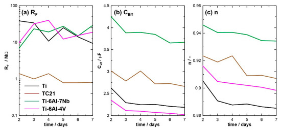 Figure 7 depicts the electric parameters obtained on the base of RS(QRF) EEC and their changes during the one-week exposure. The higher was the RF, the lower was the corrosion current density, offering an easy comparison in uniform corrosion resistance of investigated alloys (see Figure 7a). Each investigated alloy was characterized with very high resistance, order of MΩ, owing to a presence of a passive layer tightly covering the metal surface. Nevertheless, for TC21 alloy, RFvalue wasone order of magnitude lower and slowly but consistently decreased throughout the exposure, revealing its lower corrosion resistance and corroborating DC electrochemical studies.