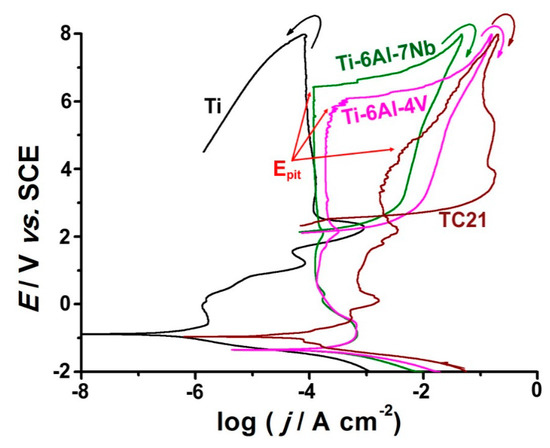 - Stable passivity of Ti-6Al-7Nb and Ti-6Al-4V alloys was translated into an obvious anodic (more noble) drift in their pitting potential (Epit) versus that of the TC21 alloy.