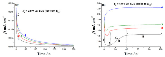 At an Ea value very close to Epit (Figure 9b), the j/t curves with three different stages (I–III) were recorded. Similar results were previously obtained in our lab [55,57]. Stage I refersto the passive layer electroformation and growth, as its current fellwith time [54,55,57]. Stage I ended at a certain time (ti), the incubation time, where Stage I’s current reached its minimum value; ti is defined as the time the adsorbed aggressive Cl− anions must acquire to locally attack and subsequently remove the passive oxide film [54]. The magnitude of ti, more specifically its reciprocal value (1/ti), denotes the rate of pit initiation and growth [54,55], and measures the susceptibility of the oxide film to breakdown and initiate pit formation and growth.