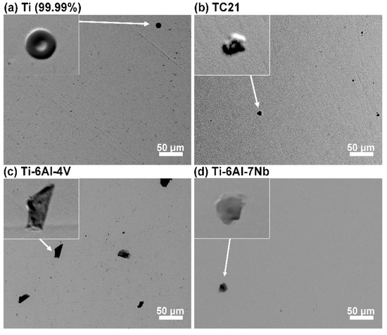 SEM micrographs taken in secondary electron mode for each investigated sample: (a) pure Ti as a reference; (b) TC21 alloy; (c) Ti-6Al-4V; and (d) Ti-6Al-7Nb at the end of one-week exposure in 0.9% NaCl at 37 °C. Magnification: × 500. In the inset, back-scatter electron topography mode images of selected surface defects. Magnification: × 2000.