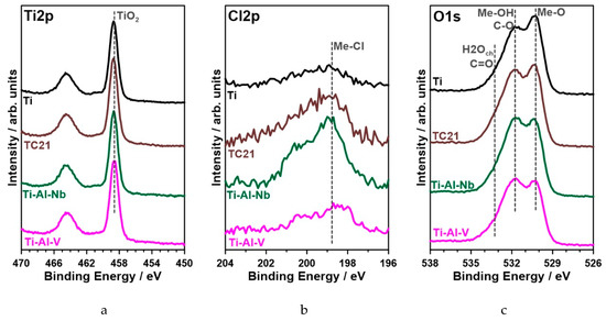 The chemistry of the passive layer in each examined case was composed primarily of titanium (IV) oxides, as verified by a strong recorded Ti2p peak doublet, with Ti2p3/2 component located each time at 458.6 eV [48,59,60] (Figure 11). Furthermore, there was no sign of titanium oxides at lower oxidation states corroborating the aforementioned result (see Supplementary Materials, Figure S5). Besides the titanium, other alloying additives also tookpart in the passivation process. The strongest signal among the alloying additives was recorded for aluminum oxide Al2O3 (Al2p3/2 peak at 74.5 eV), ranging between 3.5 and 3.8 at.% for each sample [61,62]. The contribution of VO2 (V2p3/2 at 516.4 eV) in Ti-Al-V and Nb2O5 (Nb3d5/2 at 207.1 eV) in Ti-Al-Nb alloy did not exceed 0.7 at.% [60,63,64]. The passive film formed on the surface of TC21 alloy was naturally more complex. Besides TiO2, it wascomposed of Al2O3 (3.8 at.%), Nb2O5 (0.3 at.%), ZrO2 (0.4 at.%, Zr3d5/2 at 182.4 eV), Cr2O3 (0.8 at.%, Cr2p3/2 at 576.0 eV), SnO2 (0.1 at.%, Sn3d3/2 at 486.5 eV), MoO3 and MoO2 (0.2+0.2 at.%, Mo3d5/2 at 232.9 and 229.2 eV, respectively) [65,66,67,68].