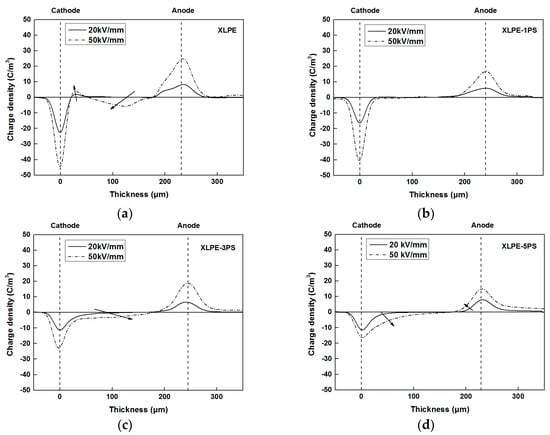 Figure 2 presents the space charge distribution of all the samples under different applied electric fields. In the bulk of XLPE, a positive charge near the cathode and a negative charge near the anode indicated the formation of a heterocharge and the charge peak increased with the applied electric field. While in XLPE with PS, apparent homocharge accumulated near the electrodes. With the increase of PS content, charge density of the cathode and anode tended to decrease, indicating that electrode injection was enhanced by the introduce of PS. These results suggest that certain quantities of PS could help to suppress space charge accumulation in XLPE.