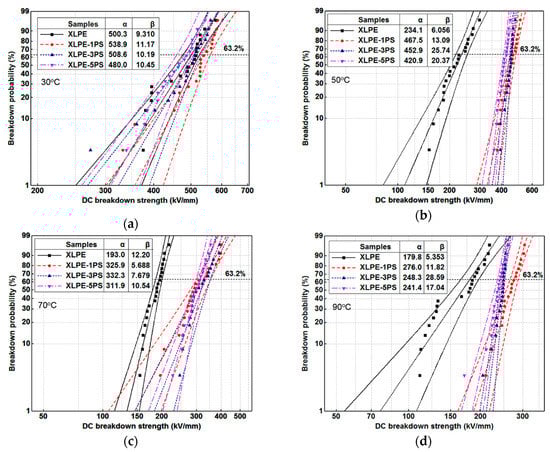 Weibull distribution of DC breakdown strength for samples under different temperatures, (a) 30 °C; (b) 50 °C; (c) 70 °C; (d) 90 °C.
