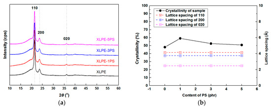 in which χ represents crystallinity of samples; A110, A200, and A020 are the areas under the peaks at 21.4°, 23.7°, and 36.1° respectively; Aamorphous is the area of the peak at 19.8°. The area of all the peaks could be calculated from peak analysis. As shown in Figure 7b, the results from XRD show that a small content of PS could increase the crystallinities of XLPE. But with the increase of PS content, the crystallinities of samples tended to decrease. The increase of crystallinity for a small loading of PS may be attributed to several reasons. PS participates in the crosslinking reaction with LDPE, thus consumption of DCP becomes less for LDPE and more branches of LDPE molecules could attend the formation of lattices, which is in accordance with the results of FTIR. Meanwhile, PS and LDPE are not compatible, and the polymer surface of PS may therefore induce crystallization of LDPE. A similar behavior has been reported in other polymer blends [20].
