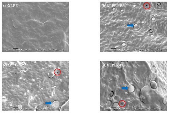 SEM micrographs of cryogenically fractured surfaces for samples. (a) XLPE; (b) XLPE-1PS; (c) XLPE-3PS; (d) XLPE-5PS. (Arrow: cross section, circle: cavity).