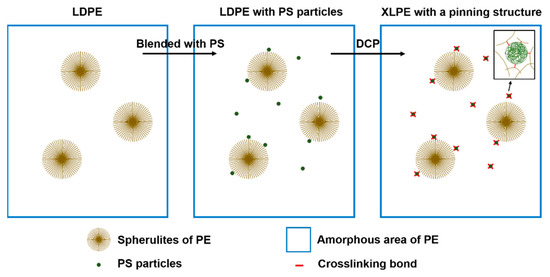 From the results above, it is clear that at first PS disperses into LDPE matrix as spherical particles, and next, by the assistance of DCP, these particles could get access to the crosslinking network. Then during the crystallization, impurities, PS particles, and uncrystallizable polymer are rejected and finally settle in the spherulite boundaries. Hence a pinning structure in XLPE with PS particles come into being, as shown in Figure 9, which is in accordance with SEM photographs of etched surfaces of material samples.