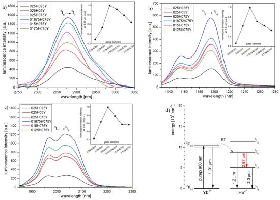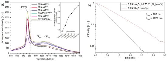 - Zhou, B.; Wei, T.; Cai, M.; Tian, Y.; Zhou, J.; Deng, D.; Xu, S.; Zhang, J. Analysis on energy transfer process of Ho3+ doped fluoroaluminate glass sensitized by Yb3+ for mid-infrared 2.85 μm emission. J. Quant. Spectrosc. Radiat. Transf. 2014, 149, 41–50. [Google Scholar] [CrossRef]